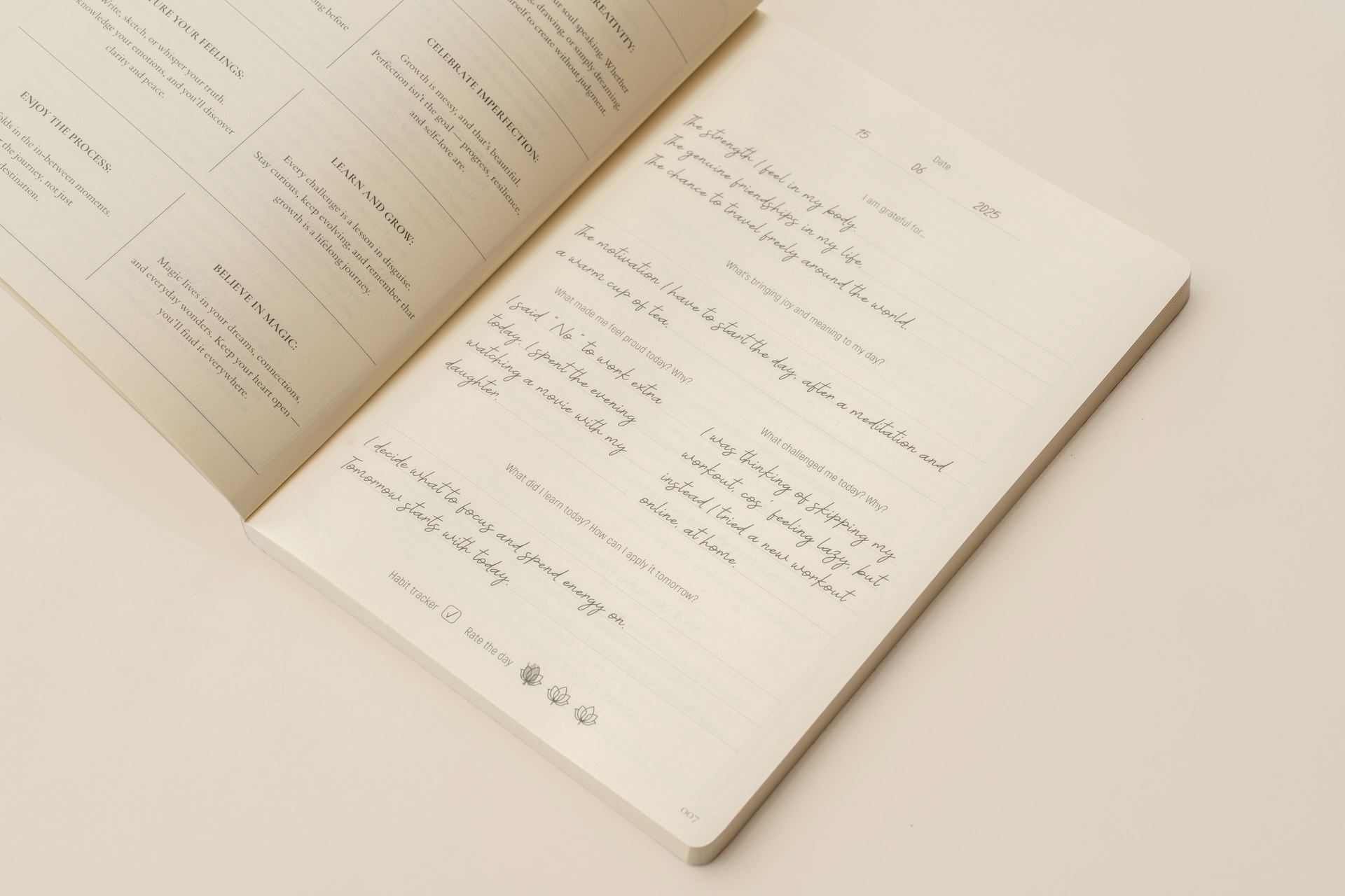 This is not a rigid planner. It's a companion that grows with you — whether you write in it every morning, once a week, or whenever you need to come back to yourself. Use it as you are, where you are.